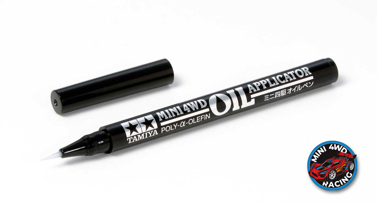 During the build process (especially a Box Stock or Basic build), it's always best to lube up the bushings in the rotating parts - wheels, gears, rollers, etc. To do that, I use Tamiya's Mini 4WD Oil Applicator Pen. It contains a super slick PAO synthetic oil that is simply magical after application - use it during your build and after every race night for consistent running.