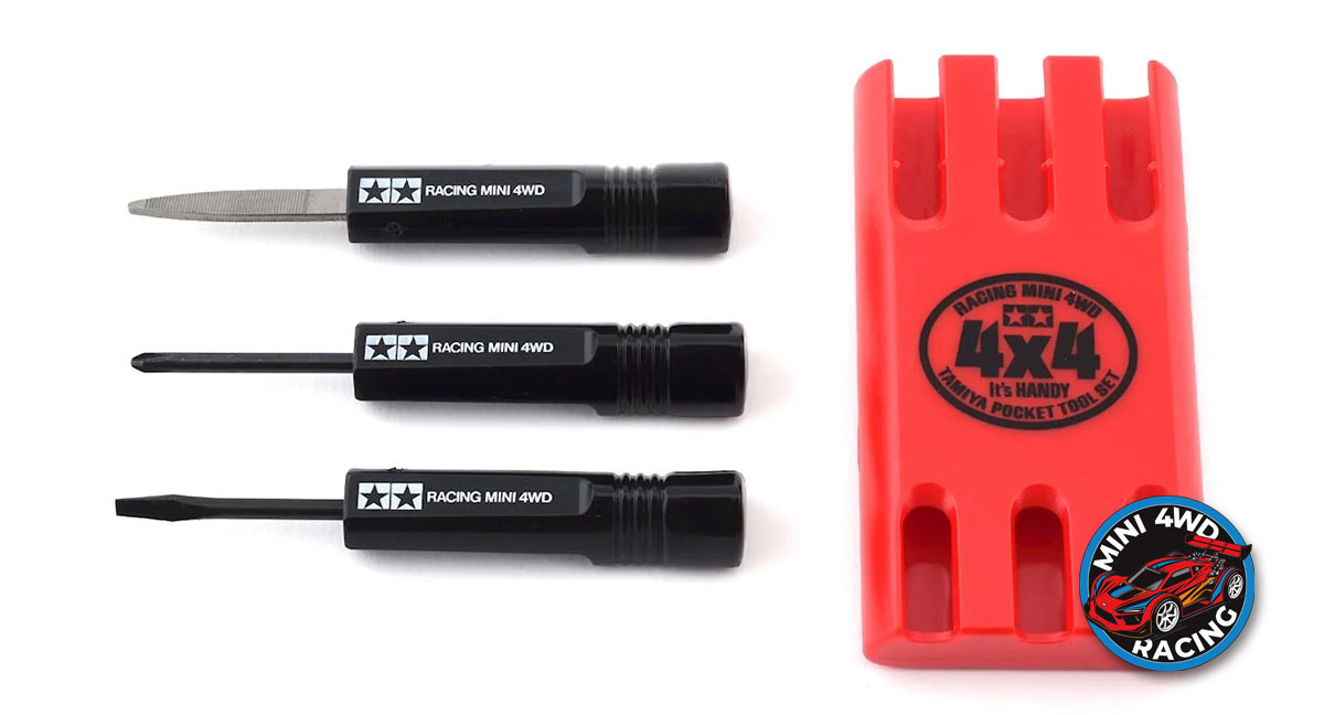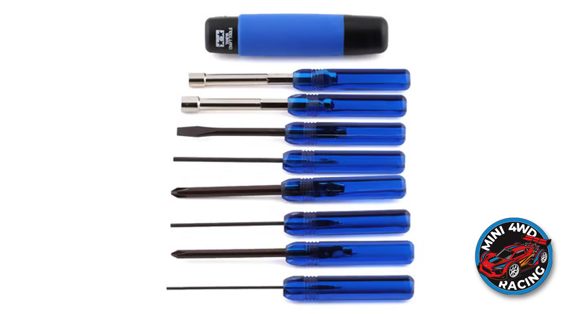 Tamiya offers a Pocket Tool Set that comes with 3 different, useful tools - a Phillips, a flathead and a file. The flathead and file can be used for generic maintenance, however the Phillips is the perfect size for Tamiya's baby JIS Mini 4WD screws. The only downsize of this set is the size of the handles - they're quite small. I've teamed this screwdriver up with Tamiya's RC Tool Set handle and it's become the perfect work tool (see the RC Tool Set below).