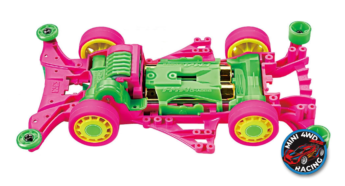 It looks like we have another version of Tamiya’s K4 Tasche incoming – the Vivid Special! This new kit duplicates the famous Mini 4WD truck but adds a HUGE splash of color – fluorescent pink and green! It also has a new, livery matching decal sheet and yellow wheels wrapped in bright pink tires.