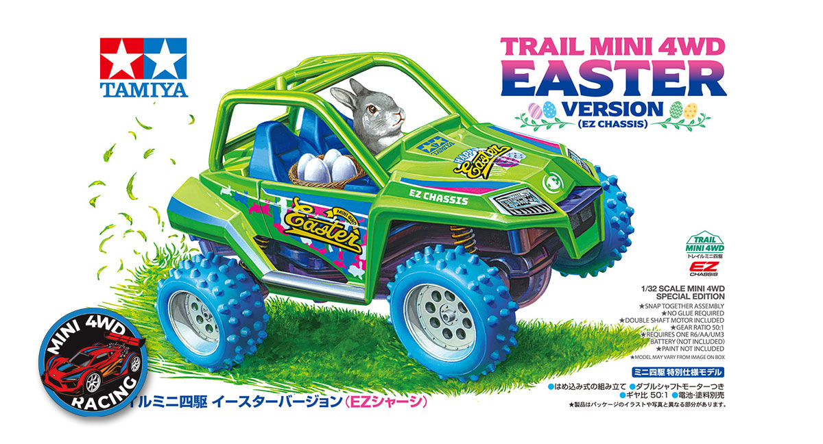 The Trail Mini 4WD is Tamiya’s latest chassis release, geared towards Mini 4WD for ‘off-track’ purposes. This special version commemorates Easter with colorful plastic parts and a special Easter Bunny driver figurine.=